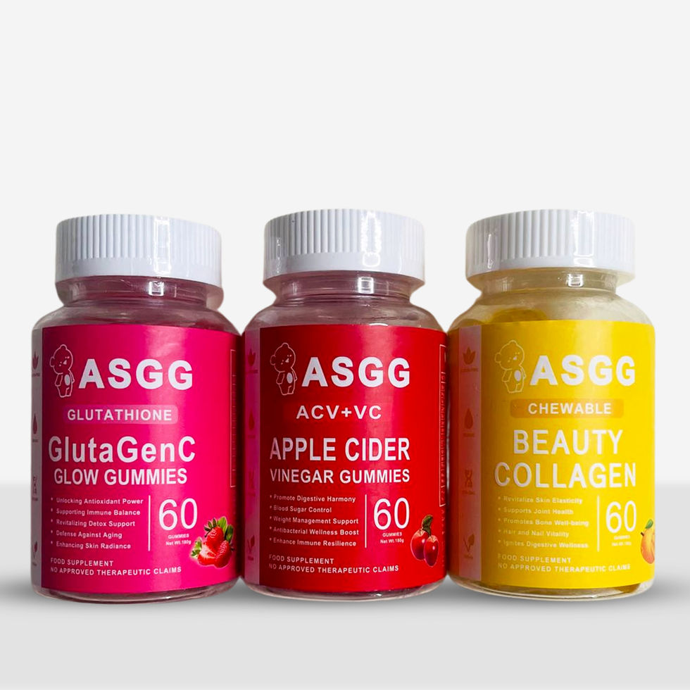A bottle containing 60 gummy supplements from the brand "ASGG", which typically stands for "Apple Cider Vinegar Gummies" - meaning these are gummy candies designed to deliver the benefits of apple cider vinegar in a convenient, chewable form; often marketed for potential digestive support, weight management, and blood sugar regulation.
